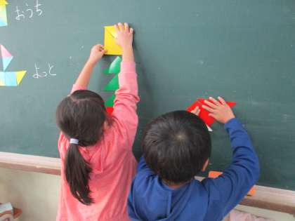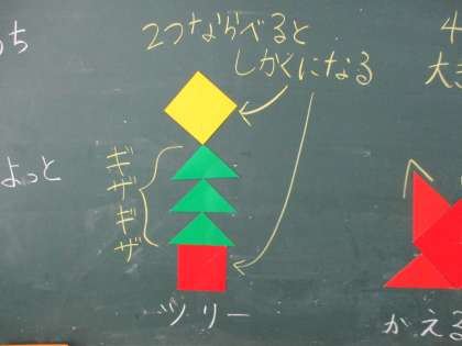 三角を2つ使うと,大きな三角・四角になる事や,並べ方を工夫すればギザギザや太陽の輪のような形が作れる事に気づきました。