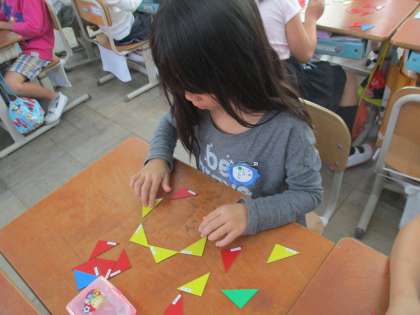 算数セットの,三角の色板を使って,いろいろな形を作って楽しみました。