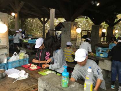 薪の用意、食器洗い、食材切りなど、役割を分担して、おいしいすき焼き風煮とご飯をつくります。