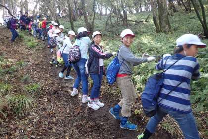 しばらくすると、ロープを握って急な道を移動しなければならない所もありましたが、アスレチックのようで楽しそうでした。ゆっくりとしたペースで山を登っています。