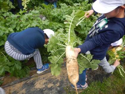 いよいよ畑の学校も最終日を迎えました。最後は,これまで育ててきた大根の収穫です。畑の学校の先生方にもお世話になって,とても大きく元気に育ちました。