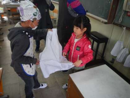 給食2日目,今日から1年生もエプロンを着て,給食当番デビューしました。