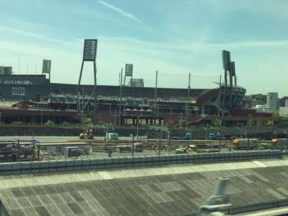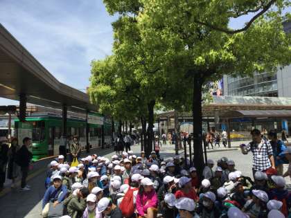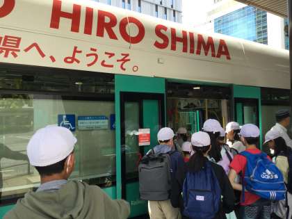 広島に到着しました。その後、市電に乗り込み、平和記念公園に向かいました。市電を待っている時、みんな路面電車が珍しいのか、電車が通るたびに顔を上げて見ていました。
