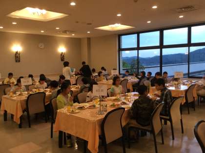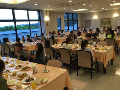 夕食の時間となりました。昼ごはんが早かったため、みんなおなかがぺこぺこのようです。今日のメニューは、ハンバーグ、エビフライと子ども達が大好きなものばかり。すごい勢いで食べ始め、すぐにご飯のおかわりをする子も。みんなとても美味しくいただきました。