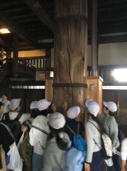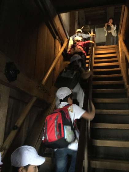 急な階段を上り下りして、天守閣の見学を終えました。空は快晴。倉敷の雨が嘘のようです。この後、姫路城とお別れしてバスに乗り込み、ほぼ予定通りの時刻に学校に向けて出発しました。
