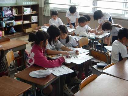 校区を回ったり調べたりして気付いたことを,グループに分かれて大きな地図にまとめていきました。グループごとにまとめ方を相談して,工夫しながらまとめていきました。次の時間は,分かれてつくった地図を,1つの大きな地図につなぎ合わせて考えていきたいと思います。