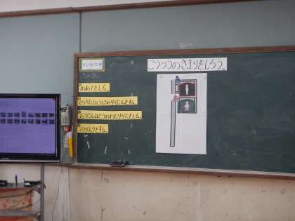 横断歩道をわたるとき,どんなことに気を付けるといいかな?赤信号のときは?信号が青になったら?と,1つずつみんなで確かめていきました。