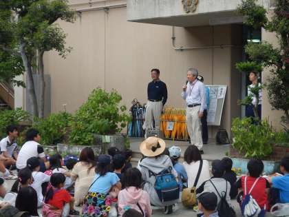 天候があやしかったですが,たくさんの小学生,中学生に加え,保護者・地域の方にも参加していただきました。諸注意等のお話を聞いた後,さっそくクリーン作戦スタートです。