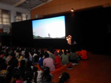 影絵劇団かしの樹さんによる「あらしのよるに」を鑑賞しました。手で形を作るような影絵のイメージとは全然違う,迫力ある影絵劇でした。