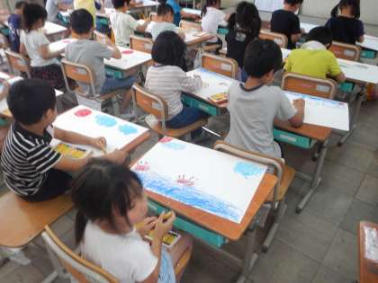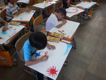 見たことやしたこと,だれと・いつ・どこで,を考えながら画用紙に絵を描きました。思い思いに,先生にこんなことを伝えよう!と張り切って絵を描いたり色を塗ったりしていました。