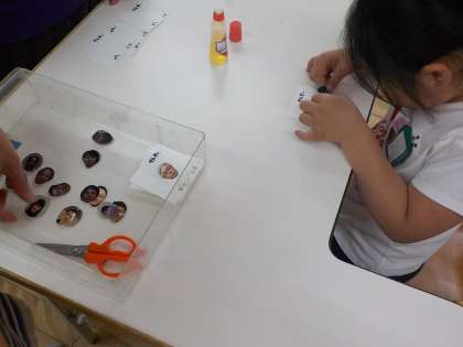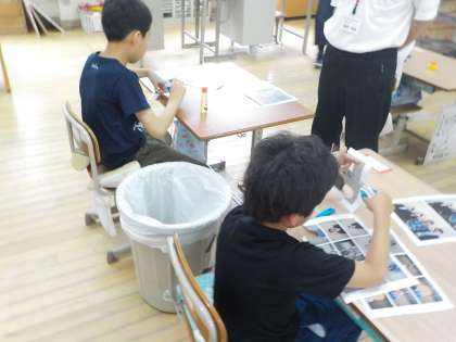 その間,子どもたちで先生方の顔写真を切って,カード作りをしています。
