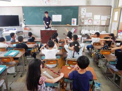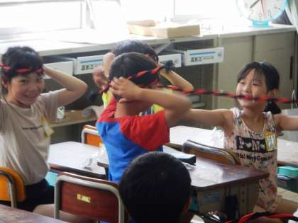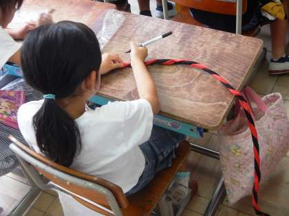 運動会の京炎そでふれで使うハチマキを配りました。袋から出してもいいよの声がかかった瞬間,みんな大喜びで頭に巻いていました。大切な大切なハチマキです。なくしたり,どっかにいったりしないように,自分の名前をていねいに書きました。