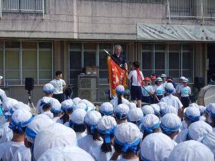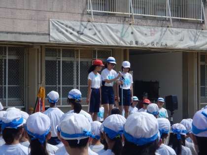 朝から暑いぐらいの天気で,青空が広がっていました。2回目の全校練習がありました。今回は開会式の練習を通しました。応援団長による選手宣誓も迫力があり,運動会の盛り上がりが楽しみになりました。