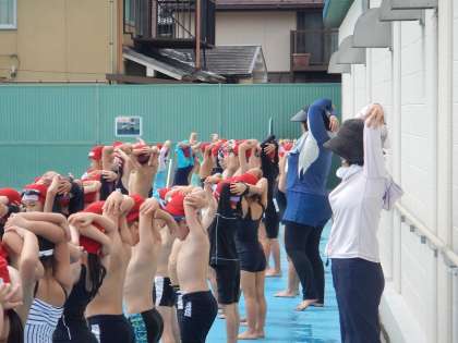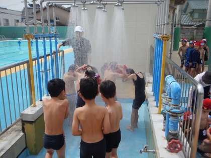 今日は小学校初めての水泳学習です。低水位での水慣れですが,子ども達みんな朝からとても楽しみにしていました。腰洗いやシャワーを終えて,準備体操の仕方も練習しました。