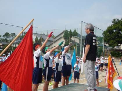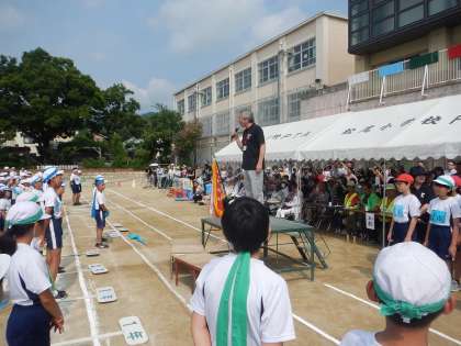 開会式,プログラムNo.1「エール交換」が終わり,現在プログラムNo.2「100m走」(5年生)です。