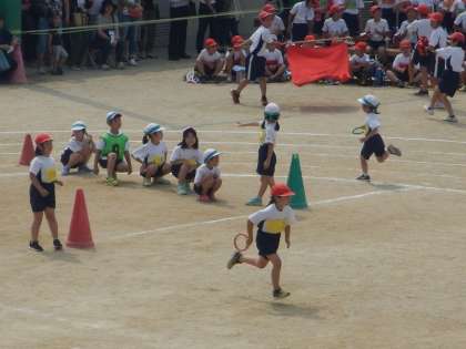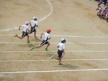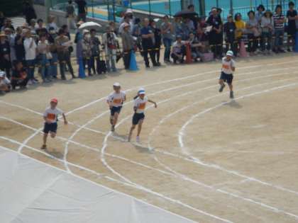 プログラムNo.2「100m走」(5年生)とプログラムNo.3「つながろう」(2年生)が終わりました。次は,プログラムNo.4「100m走」(6年生)です。