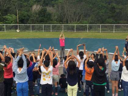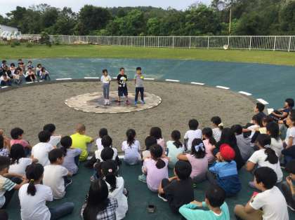 朝の集いでは、お互いに校歌を歌い、学校紹介をしました。