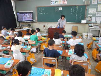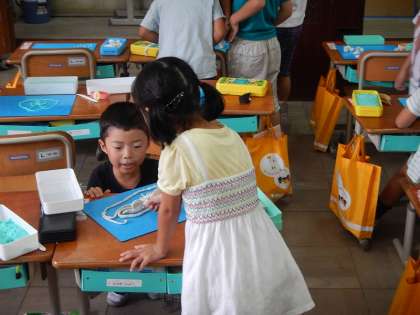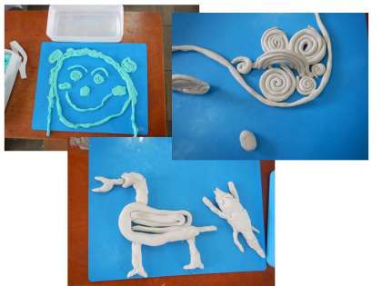 ねんどをひものように伸ばして,いろいろな作品を作りました。どんな作品が作れるか丸めてみたり,重ねてみたり,楽しみながら活動していました。出来上がった作品は,お互いに質問をしながら,鑑賞していました。