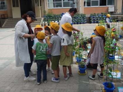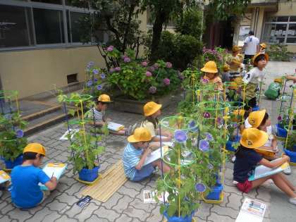 6月にお知らせした時には,まだ花は咲いていませんでしたが,7月に入ってどんどんときれいな花が咲いています。中には1年生の身長よりも高くまでつるが伸びているものもあります。今日はアサガオの花の観察をしながら,咲き終わったアサガオの花を集めました。また咲き終わった花は置いておいて,別のことに使う予定です。