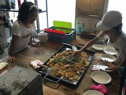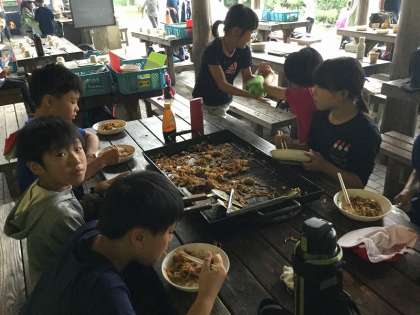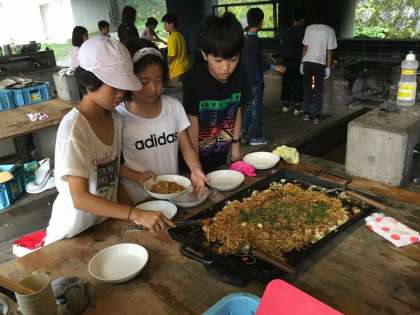 さあ、出来上がりました。とても美味しそうな出来栄えです。「とてもおいしい。味加減が最高。キャベツがシャキシャキしていて歯ごたえがよかった。」と、いろいろな感想が聞こえてきました。大きな鉄板にあった焼きそばが、あっという間になくなりました。みんな大満足でした。