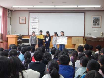 総合の学習で,校長先生や地域の方にお話を聞いたり,グループに分かれて松尾小学校や松尾の地域がもっとよくなるために,どんなことができるかを考えたりしてきました。今日は,実際にこれまでグループでもっとよくなるために計画し,活動をしてきた結果を報告しあいました。