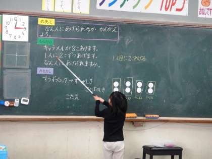 算数の学習で,何人にキャラメルを分けることができるかを,図をかきながら考えていきました。数図ブロックを上手に使いながら,ノートもがんばってかいています。
