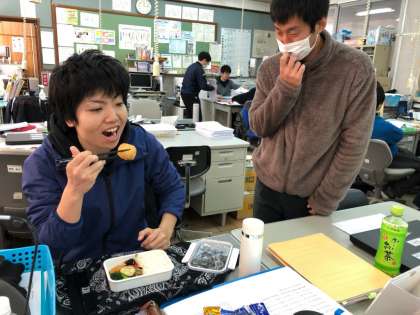 先生たちのお昼ご飯を紹介します。竹田先生はおかずがたっぷりのお弁当です!井関先生は得意の卵焼きを作ってきました!飯田先生も得意のおにぎりを・・・。