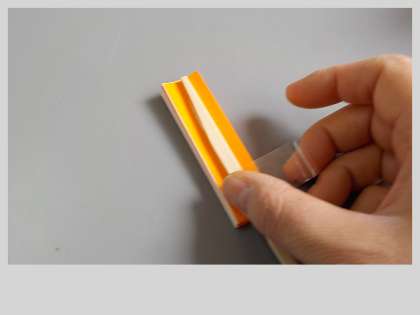 その次に,色紙とわりばしをセロテープではります。写真のように,色紙が広がる向きに注意してはります。向きをまちがえると色紙が開かなくなるので気をつけて。