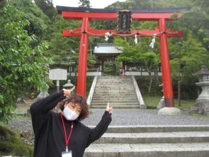 少し小さい鳥居(とりい)とすぐ後ろの石段(いしだん),石段を上がり切ったところにある神社の入り口の屋根。ひっそりとしているけれど,とてもきれいな神社だなぁと思いました。松尾小学校の校区の中には,本当にきれいな場所がたくさんあって,自転車で走るのが楽しいです。