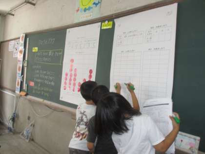 分散登校4日目。昨日,今日と4時間授業でしたが,みんながんばりました。少しずつ,元のペースをとりもどしてきました。算数では,「ひょうとグラフ」の学習に取り組みました。1年生の時の授業を思い出しながら,ハンドサインを使いました。(大きな声を出せないので,ハンドサインは,前よりいっそう有効です)。しっかり手をあげて,黒板の前に来て意見を言ってくれる人もいました。数をみんなで数える時も声を出さずに指で「1,2,3・・・」と数えました。ゲーム感覚で楽しんでいましたね。やっぱり,みんなで考える授業は楽しいですね。来週も楽しみながらがんばりましょう!