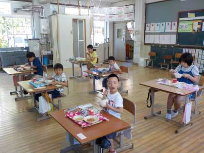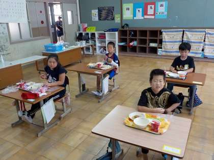 前を向いたまま,部屋ごとに分かれて食べるのは,少し寂しいですが,みんな静かに食べていました。