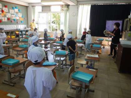 給食が配り終わったら,自分でぬいできれいにたためるかな??