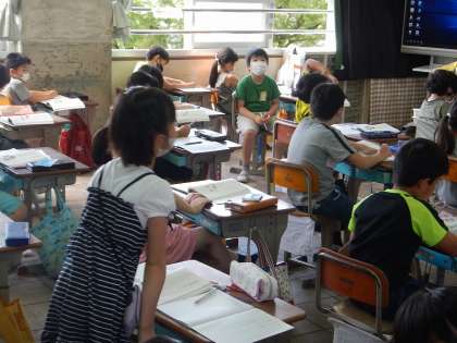 国語の学習です。今日はどんな「こま」があって,それぞれどんな楽しみ方があるのかの『答え』を見つけていきました。段落ごとにある『答え』をみんなで探し,確かめました。