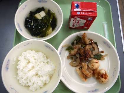 今日の給食は,京都の夏を代表する食材「鱧」です。「鱧」は梅雨の雨を飲んでおいしくなるといわれるそうで,今が旬です。今日は揚げた「鱧」に梅だれをつけて,さっぱりといただきました。