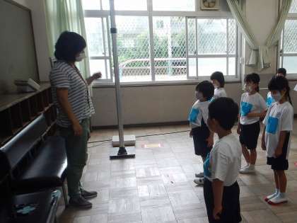間隔をあけて順番に並び,1人ずつ身長と体重を測っていきます。みんな保健室の先生のお話をしっかり聞いて,上手に測ることができました。
