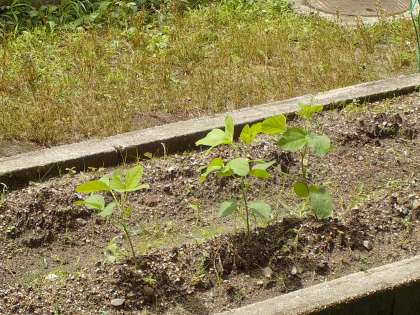 雨上がりの昼休みに,6くみばたけを見てみると,枝豆がかなり大きく育っていました。