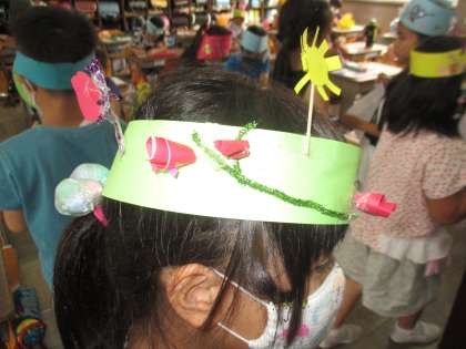 図工の学習で「わっかでへんしん」の製作をしました。色画用紙のわっかに,自由に飾りをつけて,変身できるわっかを作りました。色紙を好きな形に切ったり,目の部分を切り抜いてセロファンをはったり,モールを飾ったりして楽しい作品ができあがりました。お互いの作品を見て,「かわいい。」や「かっこいい。」などの声をかけあって変身をたのしみました。