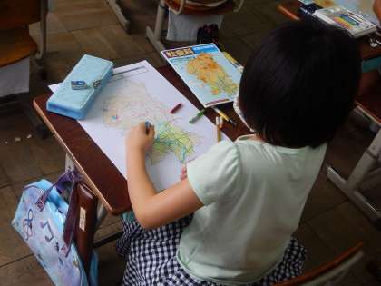 社会の学習で,京都市の白地図に,土地の使われ方で色分けをしながら,色をぬっていきました。地図も参考にしながら,ここはちょっと濃いめかなぁ?と細かいところまでがんばってぬっていました。ぬり終わったら,気づいたことを見つけていきます。たくさん見つかったかな?