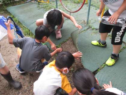 さすが子どもたち!どんなところに隠れていそうか考え,石の下やマットの下,タイヤの中など,あらゆるところをかき分けたりめくったりしながら,たくさんの小さななかまたちを探すことができました。