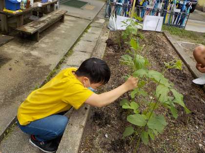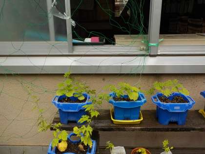 畑の前に置いてある個人の鉢では,ツルレイシも育てています。
