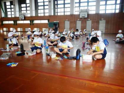 3年生も今日の晴れ間を利用して,運動場でソフトボール投げをしましたが,それはいったん置いておき,順番の待ち時間に,体育館で理科の実験の準備を進めました。