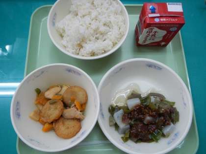 今日の給食は「京野菜のごまみそかけ」「ひらてんのにつけ」「むぎごはん」「牛乳」です。京野菜は,加茂なすと万願寺とうがらしです。