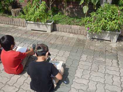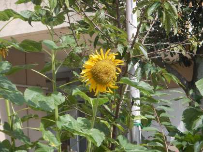 子ども達の身長を軽く追い越し,かなり上から見下ろすように咲くヒマワリを,子ども達も一生懸命見上げながら観察をがんばっていました。