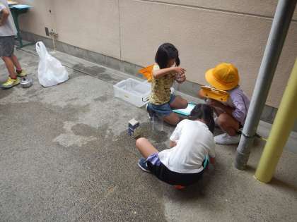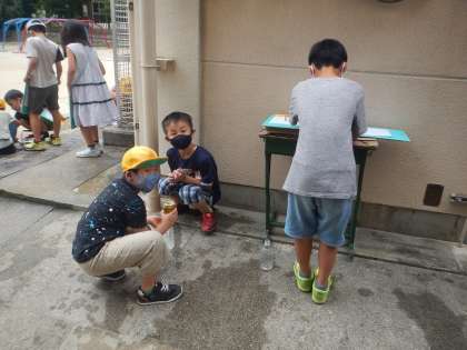 この入れ物にはどれだけの「かさ」の水が入るかな?と,グループで予想を立てながら,水のかさをはかっていきました。こぼして結果が変わらないように,慎重にそーっと水を入れ替えていました。
