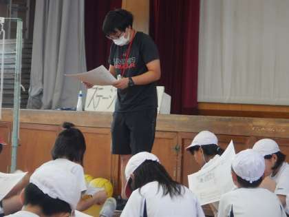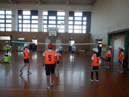 5年生になって初めてのソフトバレーボールです。4年生の時にも経験していますが,1年ぶりにボールを触ると,なかなか思うようにいかない様子です。試しに試合もしました。みんなとても楽しそうです。