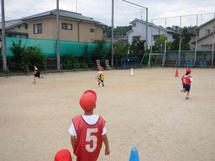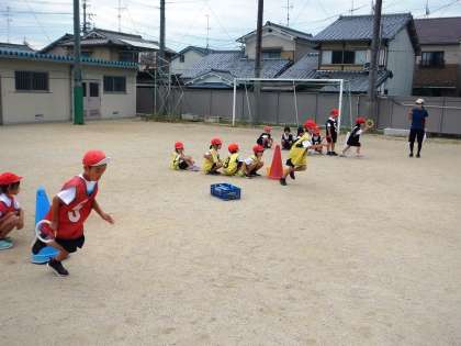 運動場で今日もリレーあそびをしました。いつもより,コーンの間の距離が長かったですが,次の人に交代するまで一生懸命走りきることができました。