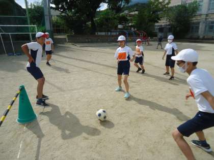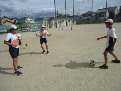 サッカーの学習をしました。チームで協力し,楽しくゲームをすることができました!