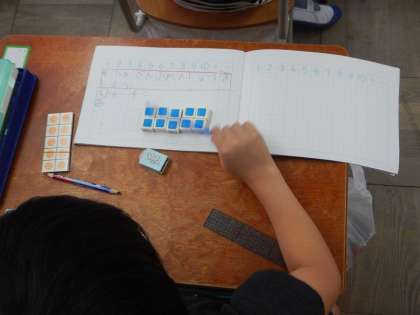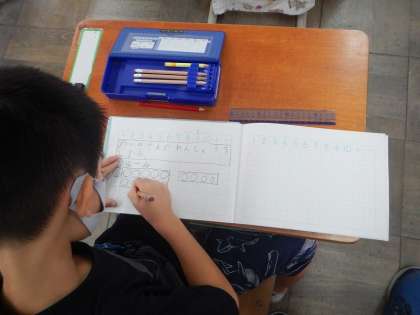 算数の学習で,問題文を写したり,自分の考えを書いたりと,はじめは,一文字ずつ場所も説明しながらノートに書き写していたのが,自分だけでノートをどんどん使いながら学習を進められるようになってきています。1年生の子どもたち,どんどん成長中です。