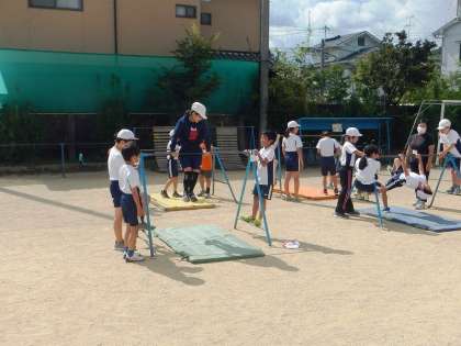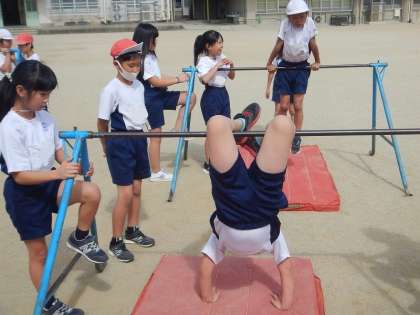 今4年生の体育の学習では,「遠投」と「鉄ぼう運動」をセットで行っています。前半は鉄ぼうに挑戦です。自分のできる技を精いっぱいがんばっていました。