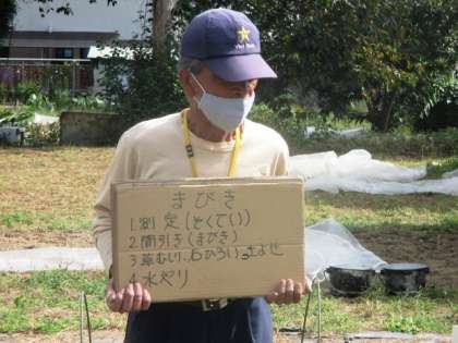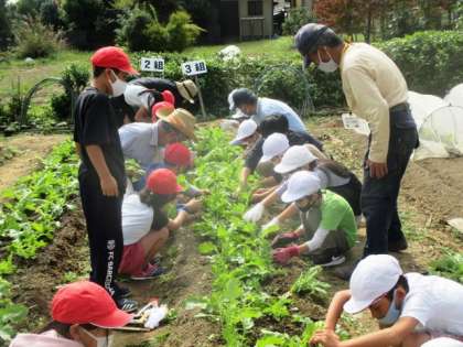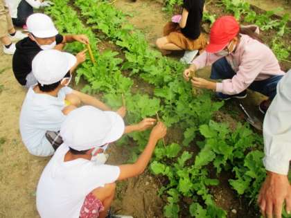 2回目の畑の学校がありました。今回の作業は「間引き」ということで,3〜4本でかたまって植わっている大根を1本だけになるよう抜いていきました。第1回の種まきから1ヶ月ほどで約30cmの葉が育っていました。成長の早さに子どもたちも驚いていました。抜き取った「間引き菜」はお土産としていただきました。